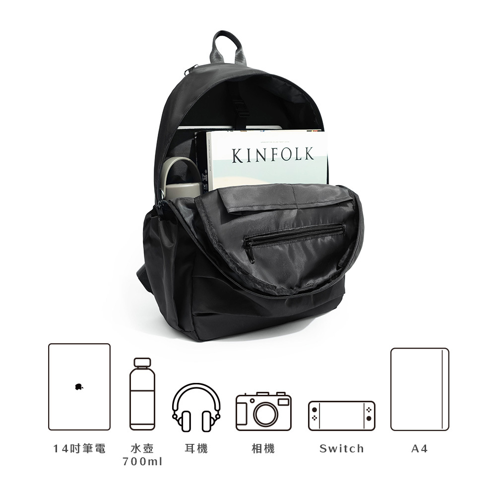 ▸可放置:14吋電腦、A4書籍、A5筆記本、長夾、摺疊傘..等
