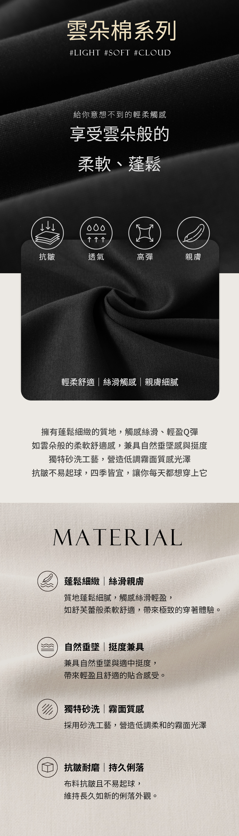 ▹布料具自然垂墜與挺度,抗皺與耐磨,不易起球