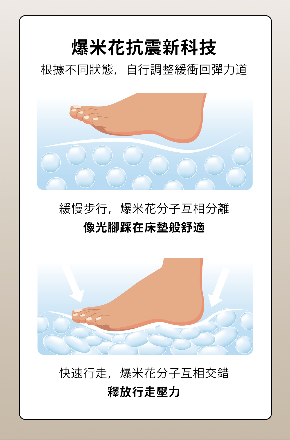 ▹爆米花抗震鞋墊 : 高回彈、高支撐、耐久穿