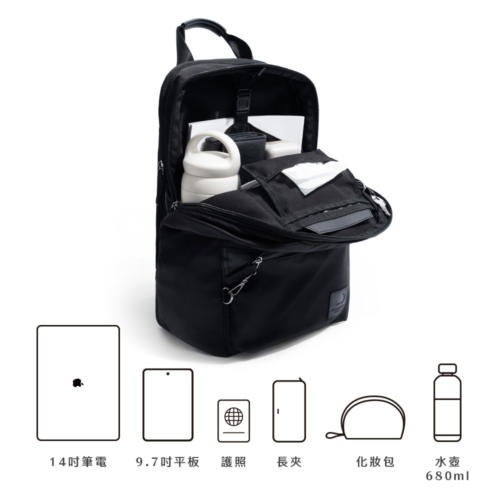 ▸可放置:14吋電腦、A4書籍、A5筆記本、長夾、摺疊傘、藍芽耳機、行動電源、化妝包...等
