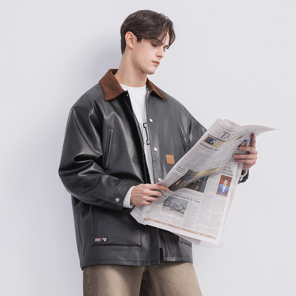 這款中性翻領皮外套以俐落翻領結構搭配率性的皮革質感,呈現帥氣又帶點復古調性的時尚風格。版型適中不貼身,兼具造型度與舒適度。細緻車線與金屬五金點綴增添質感,無論搭配簡約T恤或厚實針織都能輕鬆駕馭,是秋冬衣櫃中提升存在感的關鍵單品。