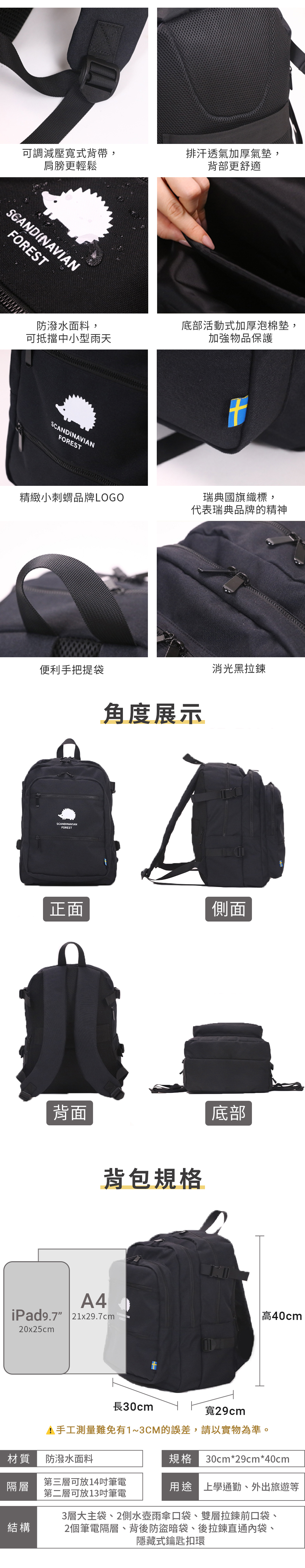 ▸可放置:14吋電腦、A4書籍、A5筆記本、長夾、長袖衣物、