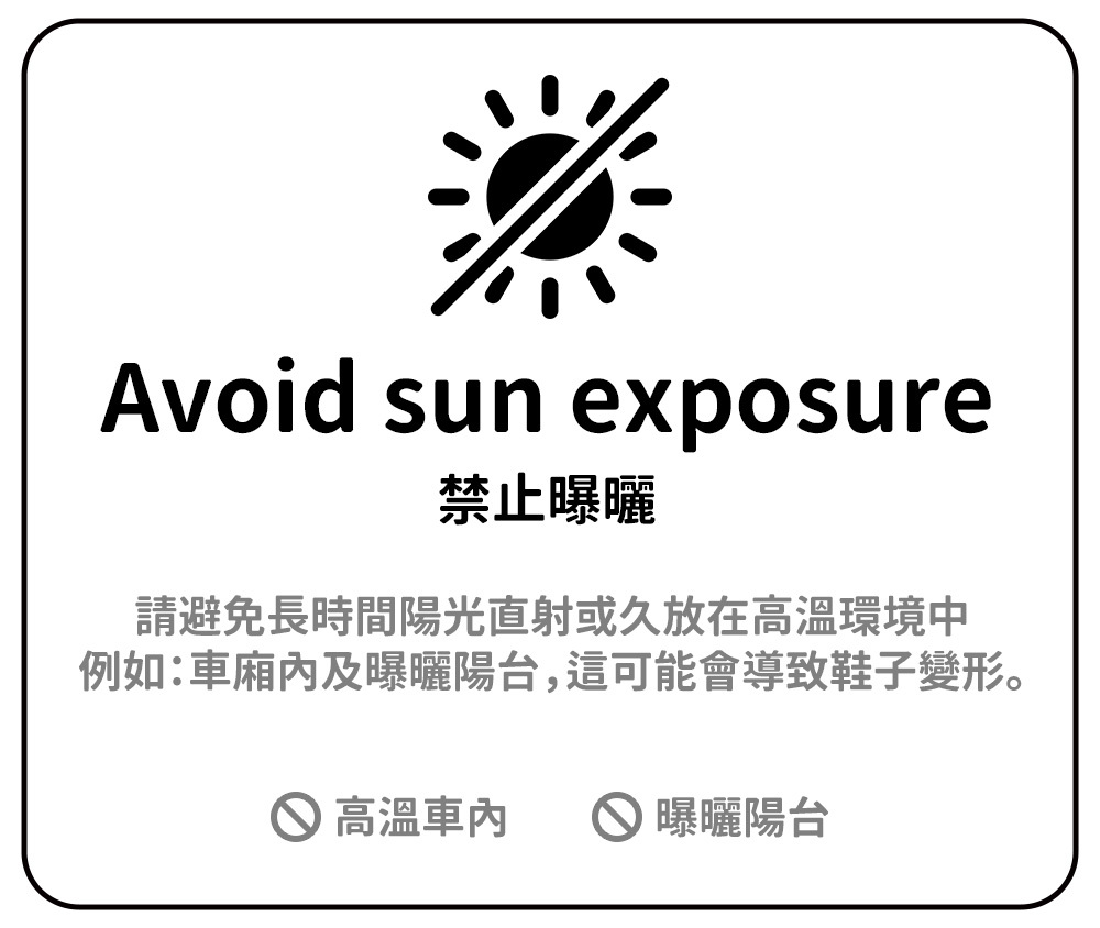 請避免長時間陽光直射或久放在高溫環境中,例如:車廂內及曝曬陽台,這可能會導致鞋子變形。