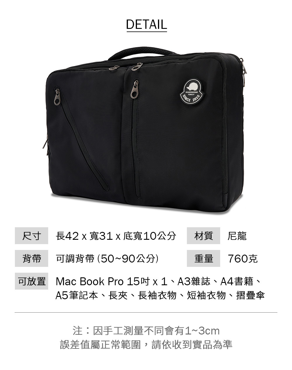 ▸ 可放:Mac Book Pro 15吋1、A3雜誌、A4書籍、A5筆記本、長夾、長袖衣物、短袖衣物、摺疊傘