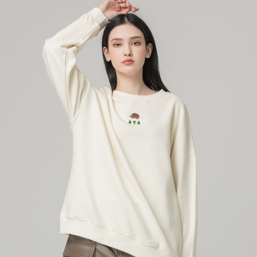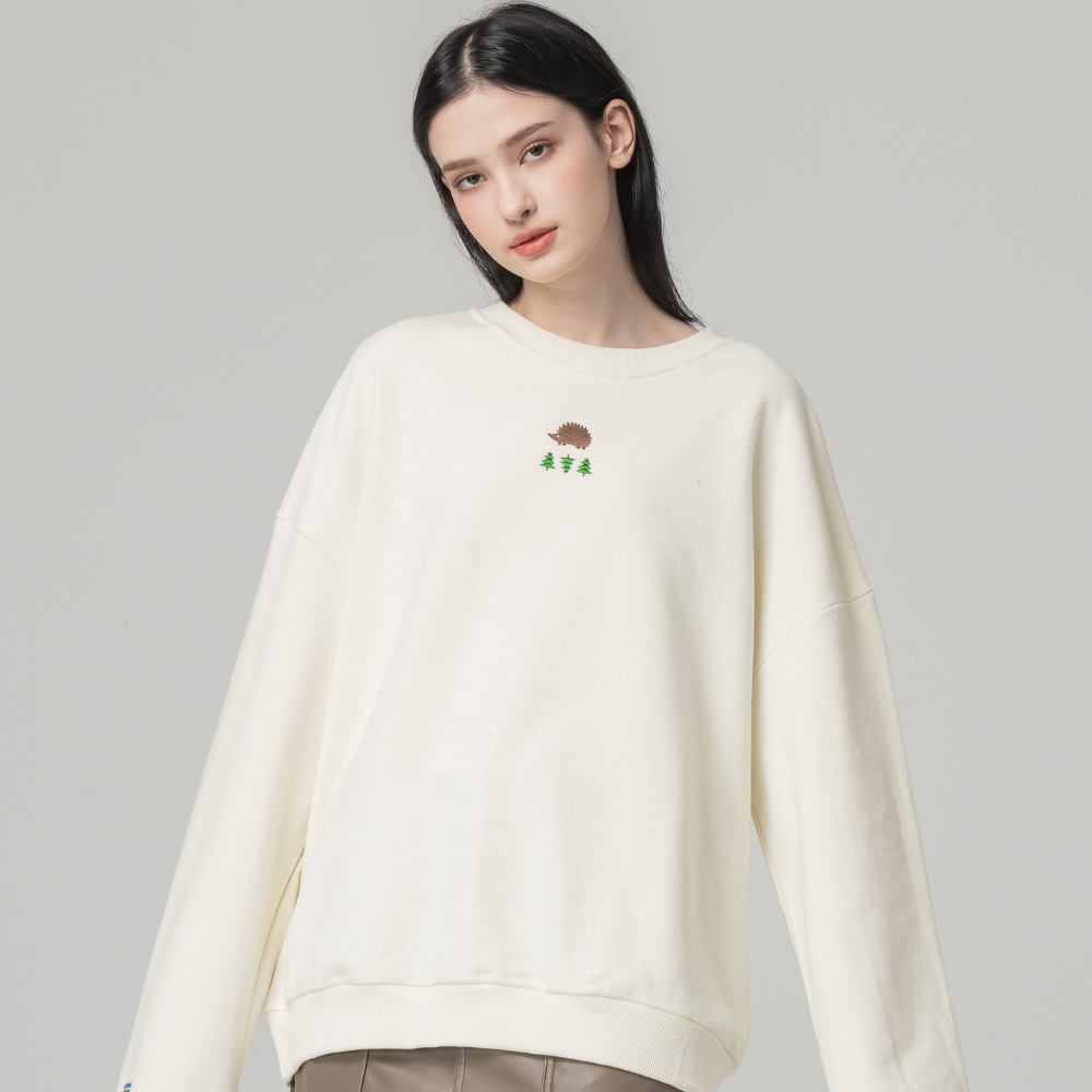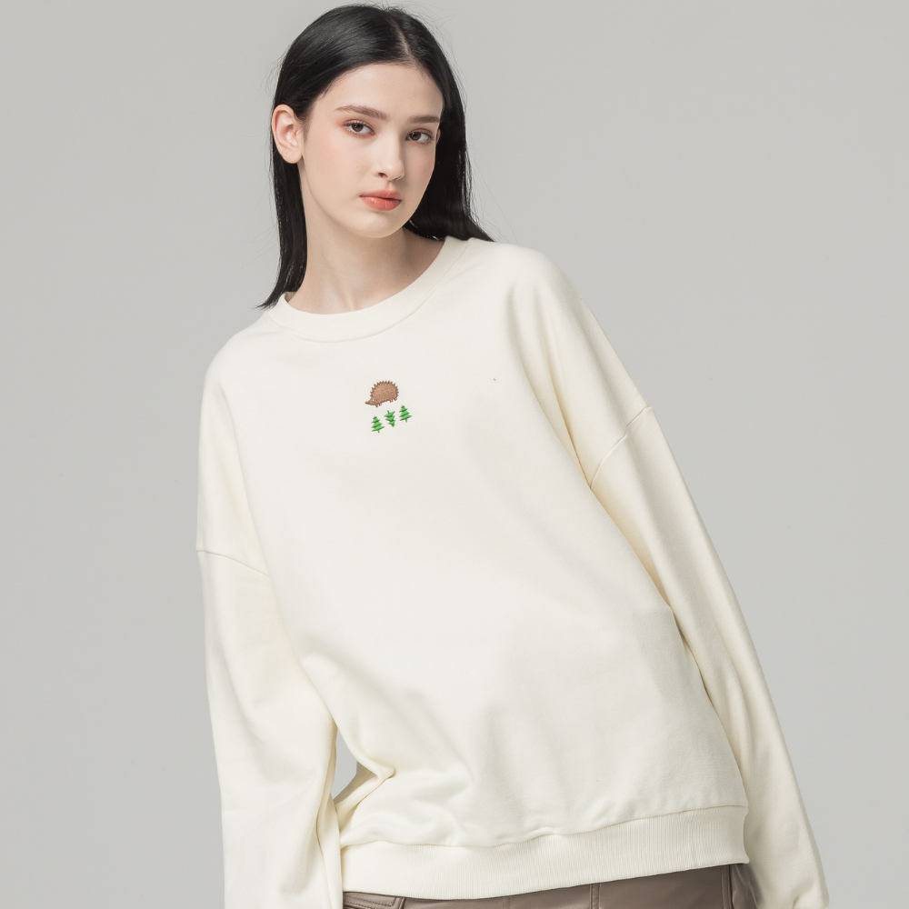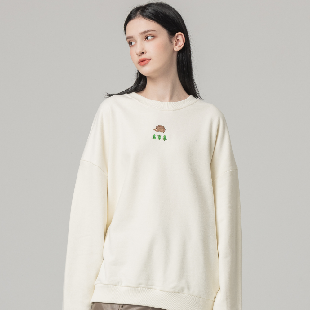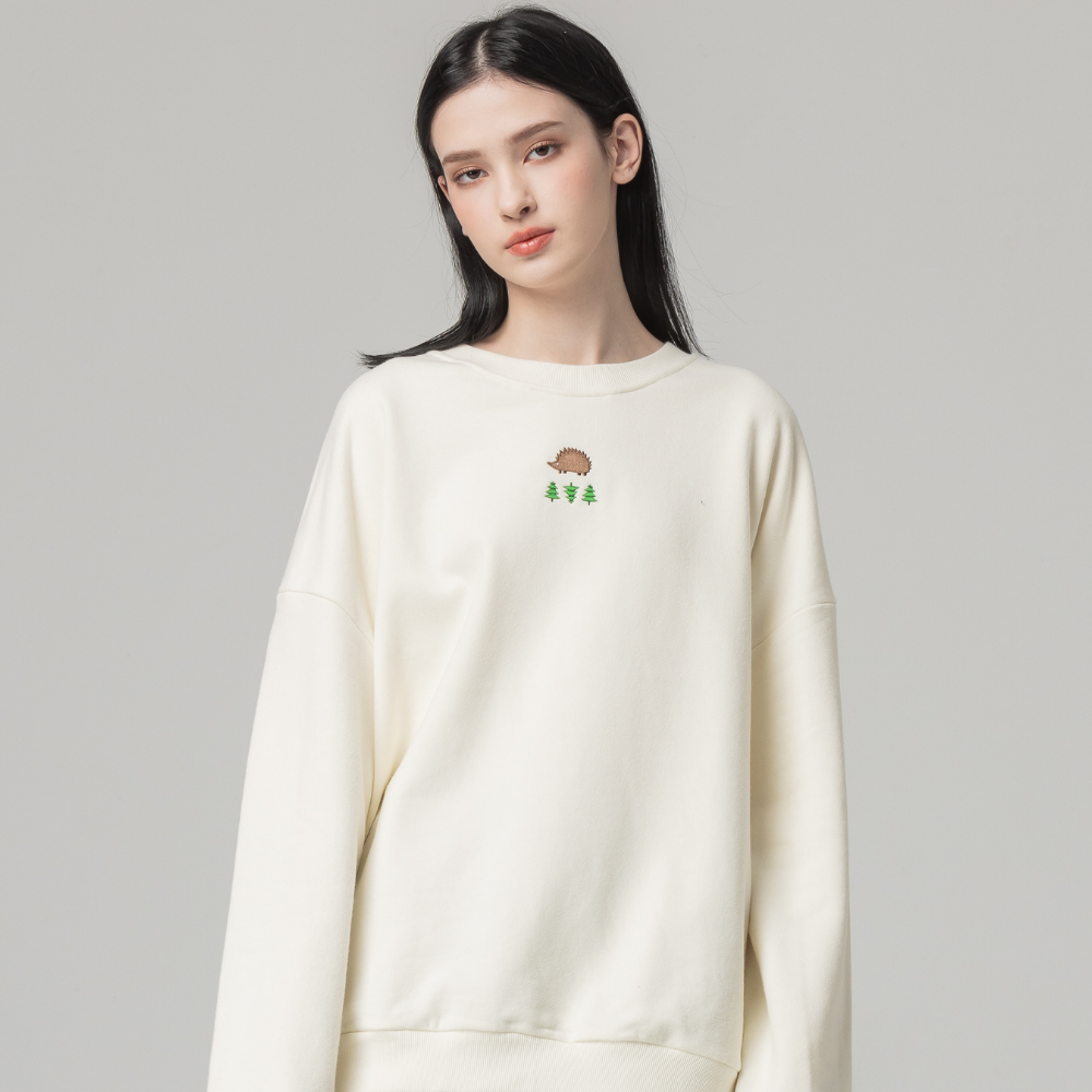 (現貨)SCANDINAVIAN FOREST北歐小刺蝟-森林電繡刺蝟雙面磨毛純棉大學T-奶油白